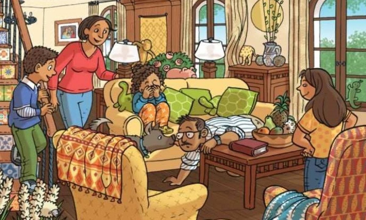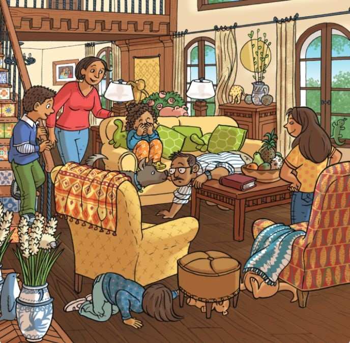 Na sliki vidimo družino, ki je nekaj izgubila in jo zdaj poskuša najti. Izgubljena predmeta sta čopič in krtača. Oče, mama in njuni otroci se neuspešno trudijo najti izgubljena predmeta, vendar jim to še ni uspelo. Družini morate pomagati pri iskanju.