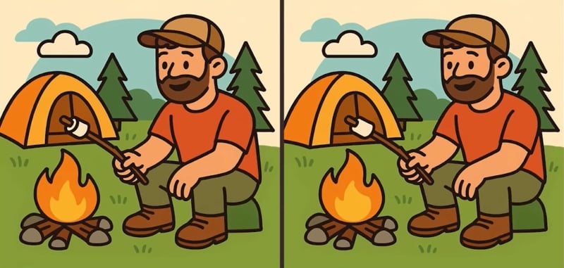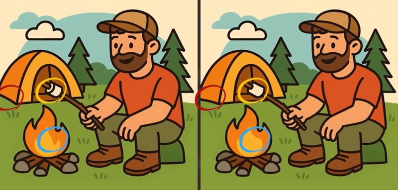 Tokrat si boste morali ogledati slike moškega, ki ob ognju peče marshmallow. Na prvi pogled sta videti povsem enaki, vendar je umetnik skril tri majhne razlike. Za njihovo odkrivanje imaš na voljo le 51 sekund!