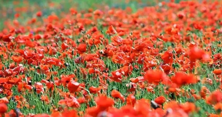Na fotografiji je makovo polje. Cvetovi prekrivajo polje kot debela rdeče-zelena odeja in ni jim videti konca. Zdi se, da te brezmejne cvetlične lepote ni zmotila nobena žival. Vendar ni tako – nekje med cvetovi se skriva čebela, ki jo bo zelo težko opaziti.