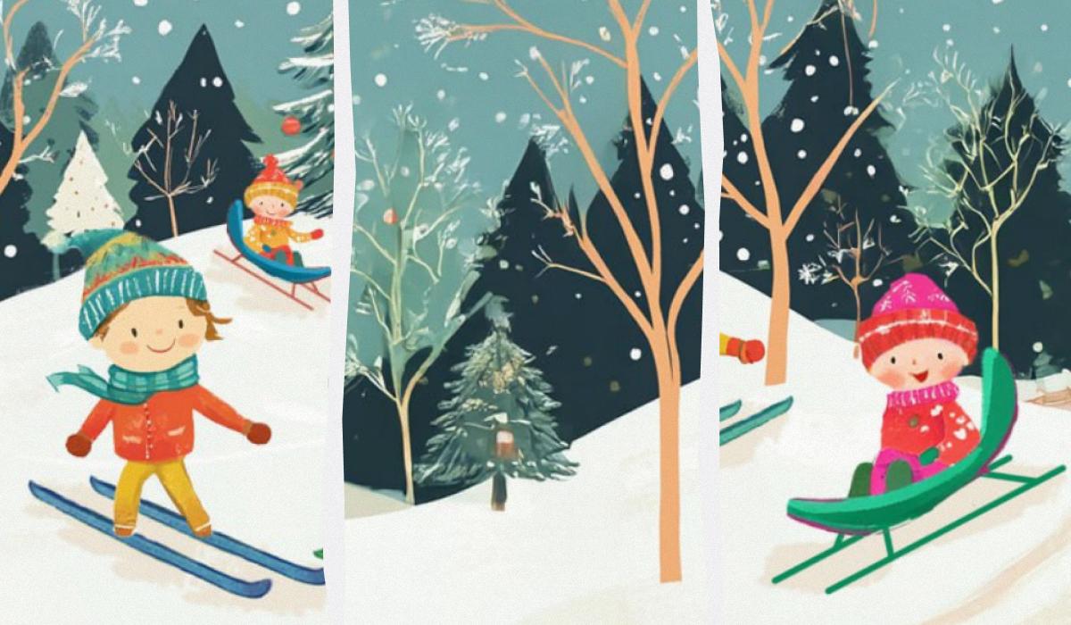Pred vami je skupina veselih otrok, ki v gozdu uživajo v snegu in pravem zimskem vremenu. Najmlajši se sankajo, njihovi starejši prijatelji pa smučajo.
