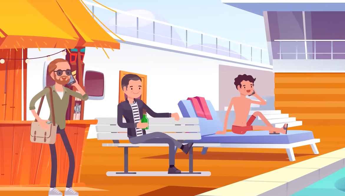 Vsak od fantov se ukvarja s svojimi stvarmi – nekateri govorijo po telefonu, drugi pa preprosto uživajo v mirnem času ob bazenu s pijačo v rokah.