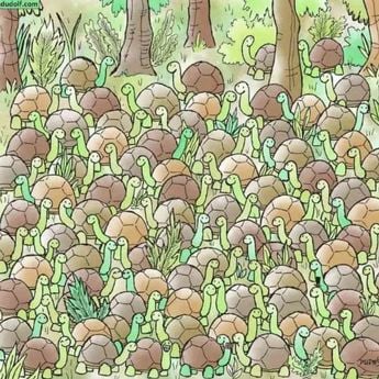 Tudi kača, ki se skriva nekje na sliki, je po obliki zelo podobna želvam, zato jo je še težje najti. Kača se zlije z želvami.