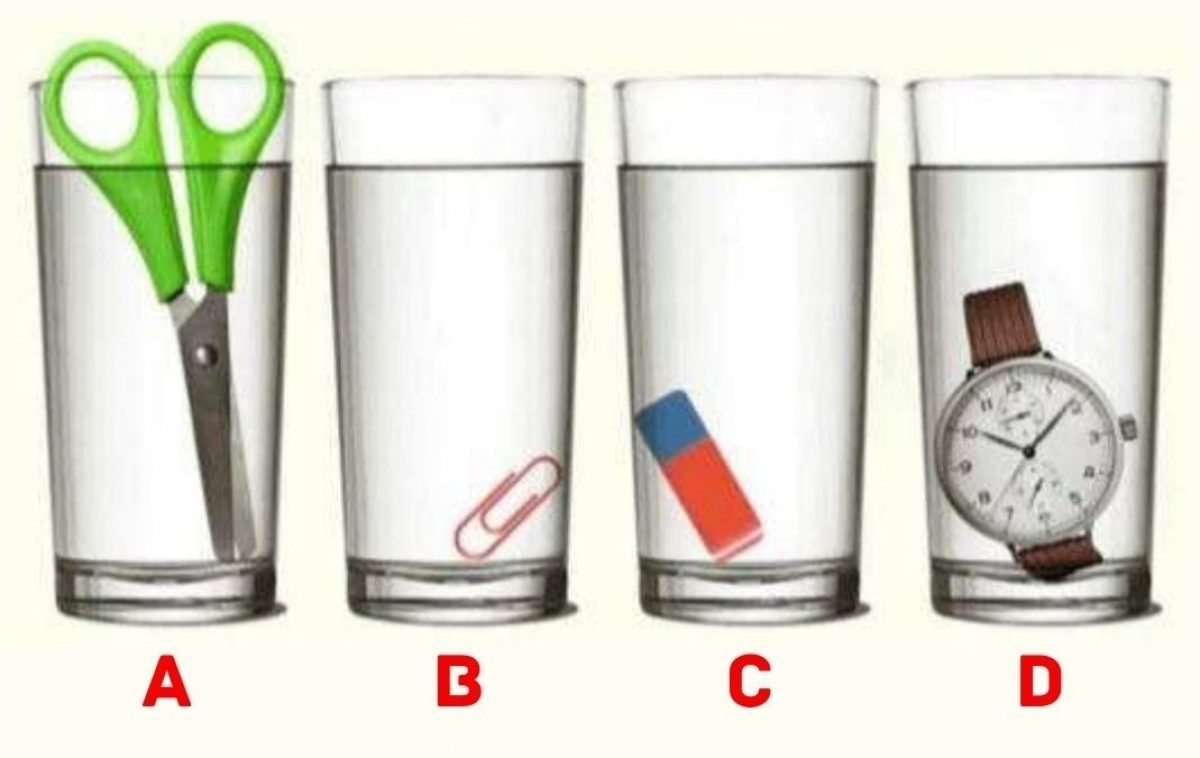 Na sliki so štirje kozarci z vodo, v vsakem pa je drug predmet: škarje, sponka za papir, gumica in ura. Ugotoviti moraš, v katerem kozarcu je več vode.