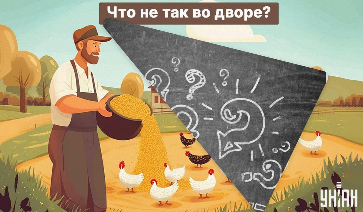 Slika prikazuje prijeten dvorišče s piščanci, ki jih lastnik hrani z izbranim žitom. Slika je videti idilična, vendar ima eno zelo resno napako. Razdelite sliko na dele in s pomočjo dobrega razmišljanja, izjemne domišljije in zdrave pameti poiščite odgovor. Ne pozabite, da imate na voljo največ pet sekund.