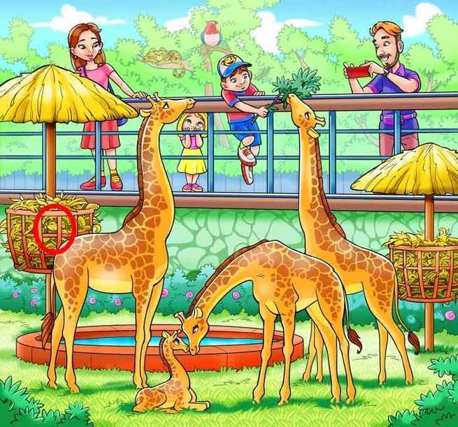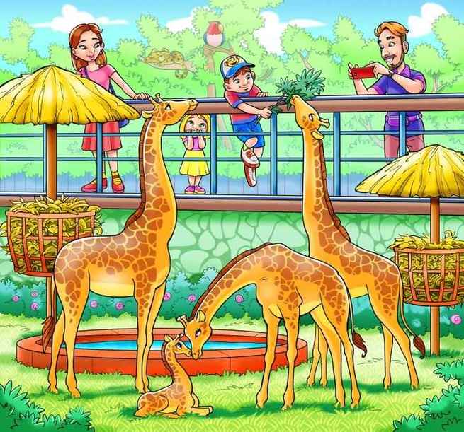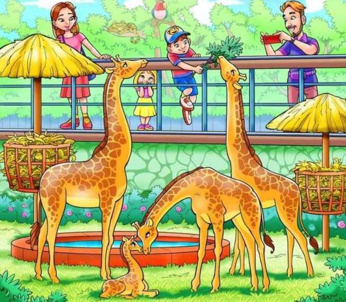 Na sliki je družina v živalskem vrtu. Moški s telefonom snema žirafe, otroci in njegova žena pa opazujejo živali. Nekje se skriva opica, ki jo morate najti.
