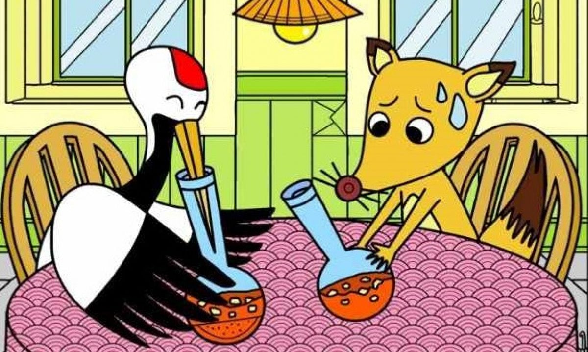 Na sliki vidimo prizor iz znane pravljice o lisici in žerjavčku. Medtem ko žerjav veselo uživa hrano iz ozke bučke, lisica le zavistno pogleduje v posodo, iz katere ne more dobiti okusne hrane.