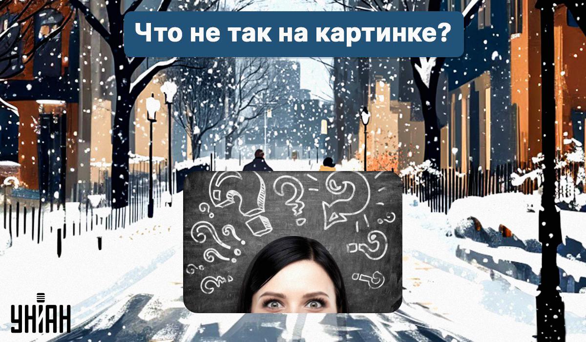 Spodaj je prikazana slika zasneženega mesta, po katerem se sprehaja par z majhnim otrokom v vozičku. Vse naokoli je prekrito s snegom, vendar na tej sliki nekaj ni v redu.